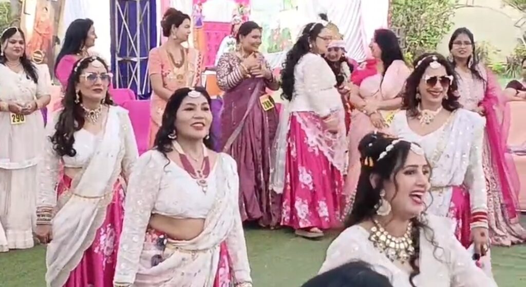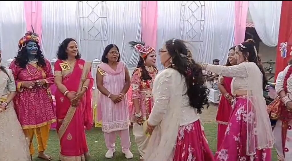 महिलाओं ने राधा-कृष्ण वेश में नृत्य प्रस्तुत किए।