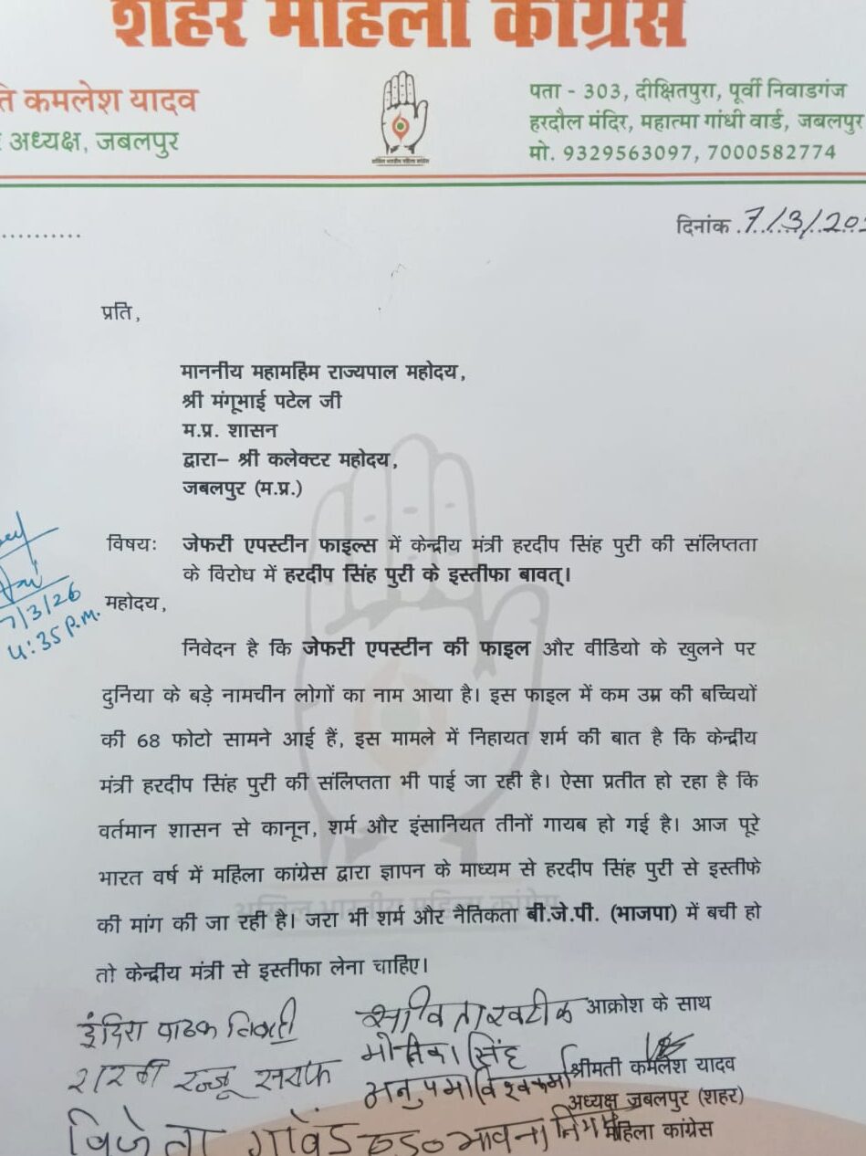 जबलपुर में महिला कांग्रेस का हल्लाबोल, एपस्टीन फाइल पर मंत्री से इस्तीफा मांग